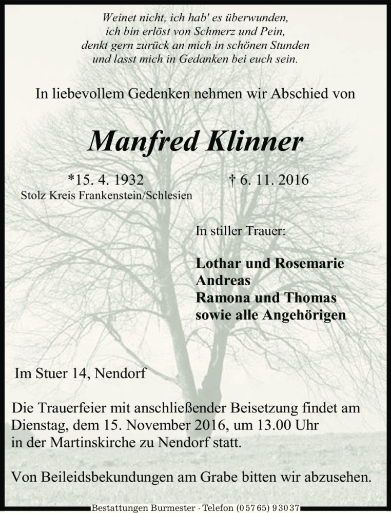 Hier finden Sie alle Traueranzeigen aus der Zeitung, die bisher für Manfred Klinner erschienen sind. Weitere Traueranzeigen, die in der Zeitung erscheinen, werden hier ebenfalls aufgelistet