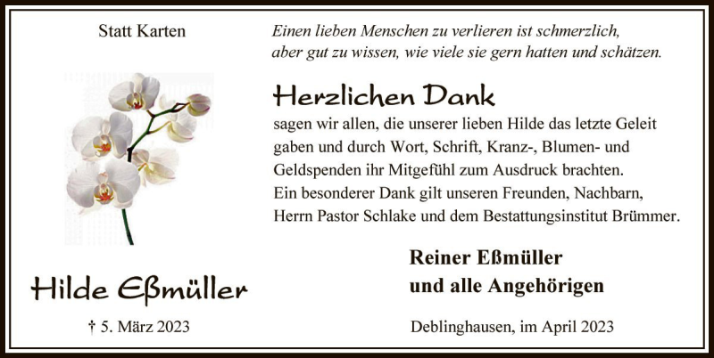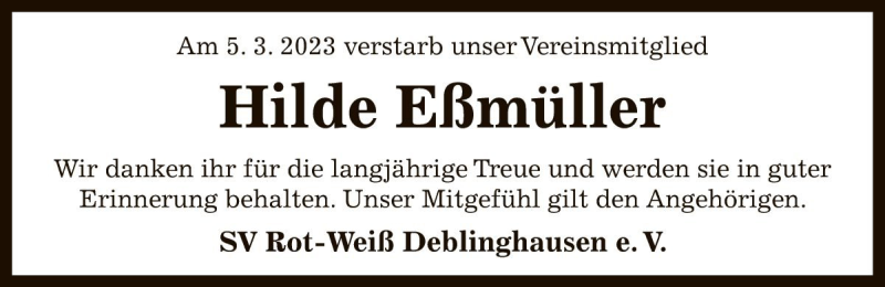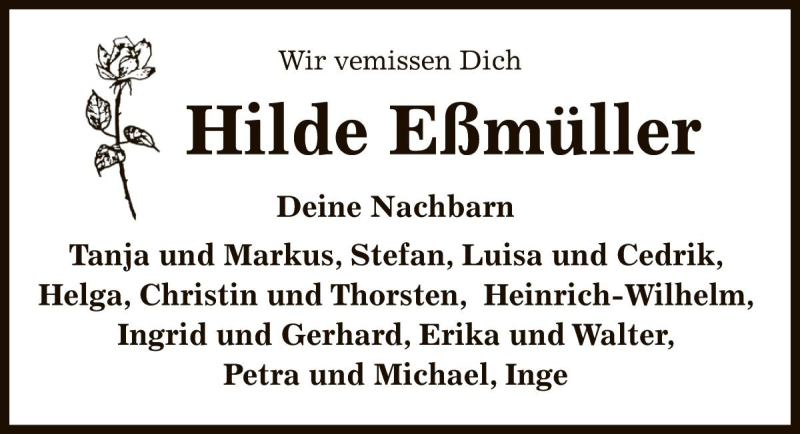 Hier finden Sie alle Traueranzeigen aus der Zeitung, die bisher für Hilde Eßmüller erschienen sind. Weitere Traueranzeigen, die in der Zeitung erscheinen, werden hier ebenfalls aufgelistet