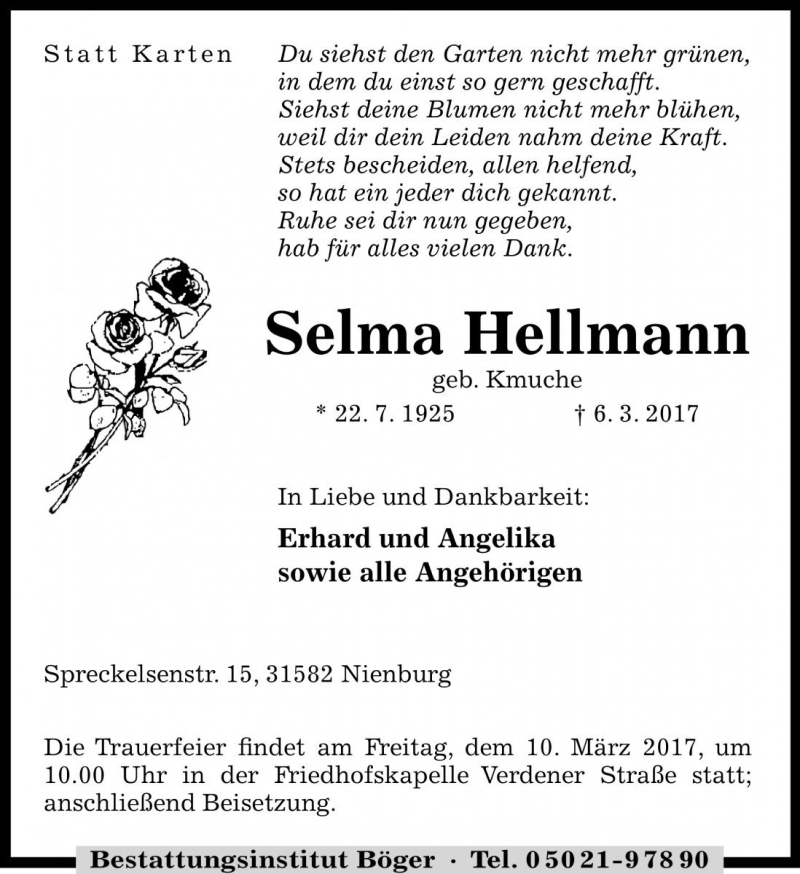 Hier finden Sie alle Traueranzeigen aus der Zeitung, die bisher für Selma Hellmann erschienen sind. Weitere Traueranzeigen, die in der Zeitung erscheinen, werden hier ebenfalls aufgelistet