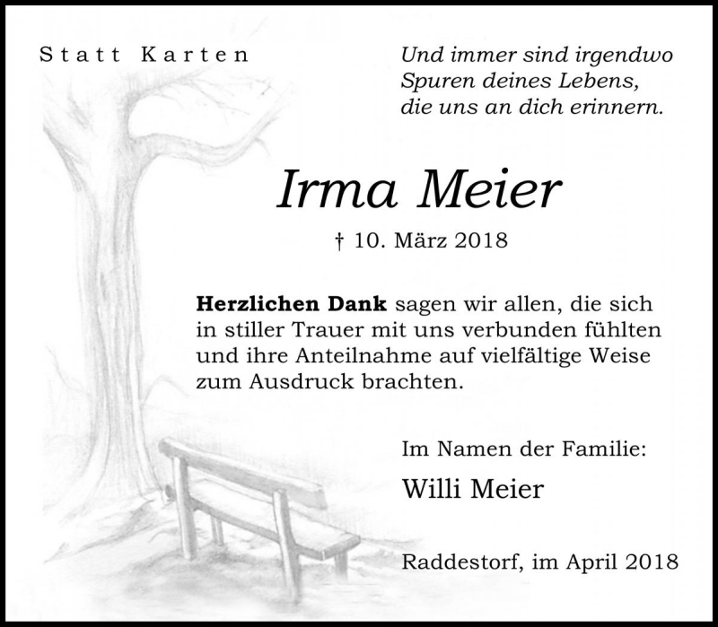Hier finden Sie alle Traueranzeigen aus der Zeitung, die bisher für Irma Meier erschienen sind. Weitere Traueranzeigen, die in der Zeitung erscheinen, werden hier ebenfalls aufgelistet