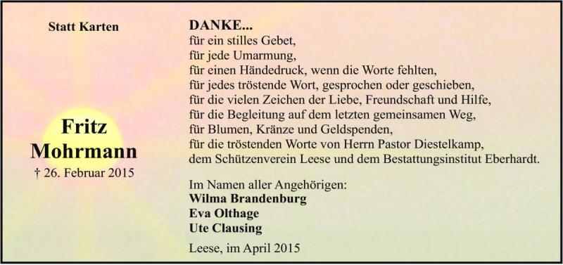 Hier finden Sie alle Traueranzeigen aus der Zeitung, die bisher für Fritz Mohrmann erschienen sind. Weitere Traueranzeigen, die in der Zeitung erscheinen, werden hier ebenfalls aufgelistet