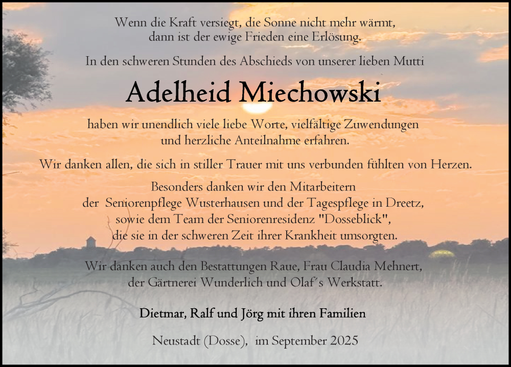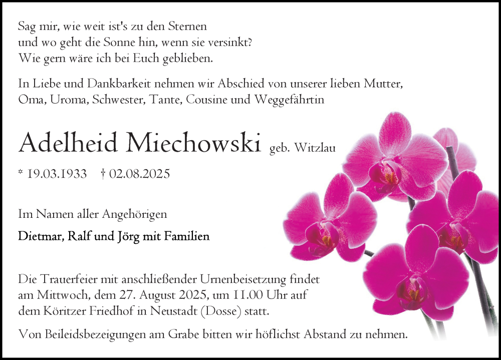 Hier finden Sie alle Traueranzeigen aus der Zeitung, die bisher für Adelheid Miechowski erschienen sind. Weitere Traueranzeigen, die in der Zeitung erscheinen, werden hier ebenfalls aufgelistet