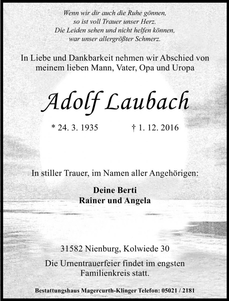 Hier finden Sie alle Traueranzeigen aus der Zeitung, die bisher für Adolf Laubach erschienen sind. Weitere Traueranzeigen, die in der Zeitung erscheinen, werden hier ebenfalls aufgelistet