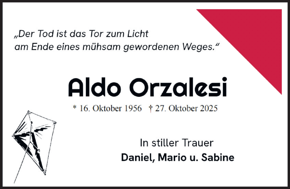 Hier finden Sie alle Traueranzeigen aus der Zeitung, die bisher für Aldo Orzalesi erschienen sind. Weitere Traueranzeigen, die in der Zeitung erscheinen, werden hier ebenfalls aufgelistet