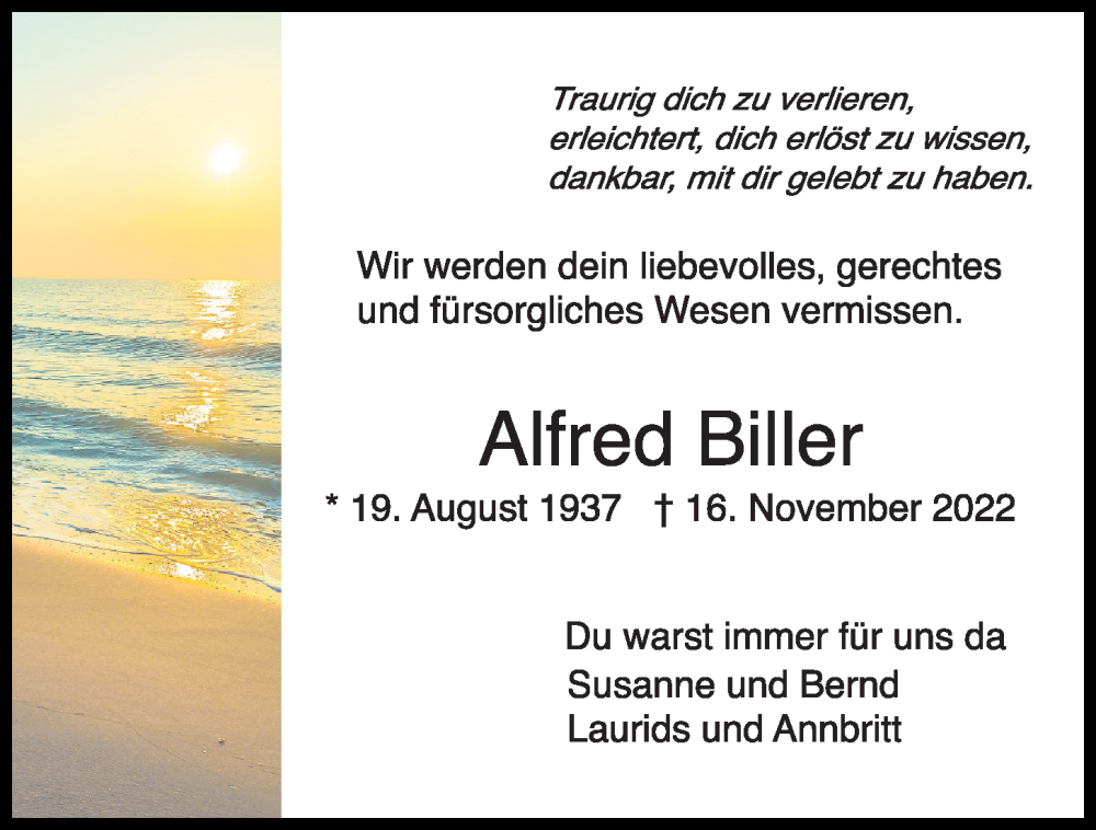 Hier finden Sie alle Traueranzeigen aus der Zeitung, die bisher für Alfred Biller erschienen sind. Weitere Traueranzeigen, die in der Zeitung erscheinen, werden hier ebenfalls aufgelistet