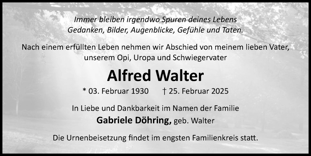 Hier finden Sie alle Traueranzeigen aus der Zeitung, die bisher für Alfred Walter erschienen sind. Weitere Traueranzeigen, die in der Zeitung erscheinen, werden hier ebenfalls aufgelistet