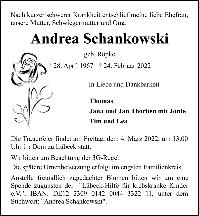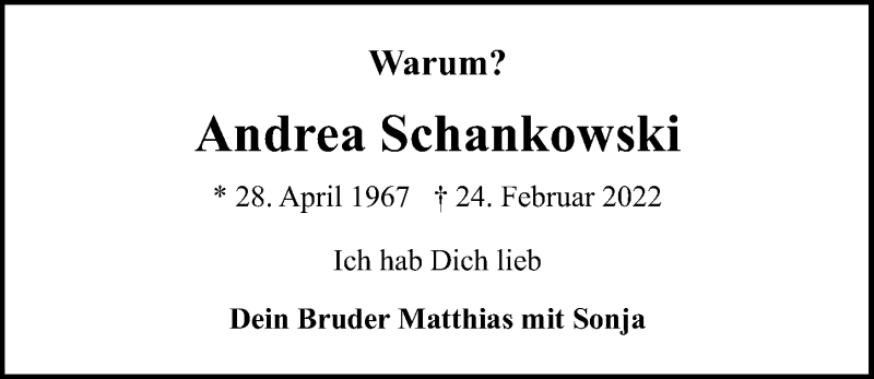 Hier finden Sie alle Traueranzeigen aus der Zeitung, die bisher für Andrea Schankowski erschienen sind. Weitere Traueranzeigen, die in der Zeitung erscheinen, werden hier ebenfalls aufgelistet