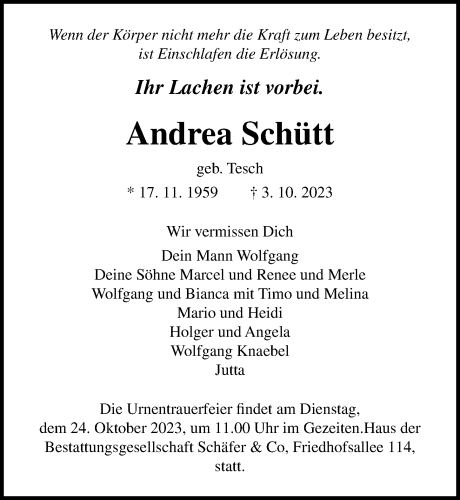 Hier finden Sie alle Traueranzeigen aus der Zeitung, die bisher für Andrea Schütt erschienen sind. Weitere Traueranzeigen, die in der Zeitung erscheinen, werden hier ebenfalls aufgelistet
