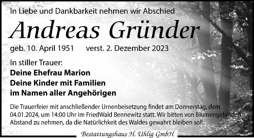 Hier finden Sie alle Traueranzeigen aus der Zeitung, die bisher für Andreas Gründer erschienen sind. Weitere Traueranzeigen, die in der Zeitung erscheinen, werden hier ebenfalls aufgelistet