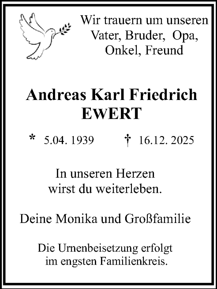 Hier finden Sie alle Traueranzeigen aus der Zeitung, die bisher für Andreas Karl Friedrich Ewert erschienen sind. Weitere Traueranzeigen, die in der Zeitung erscheinen, werden hier ebenfalls aufgelistet