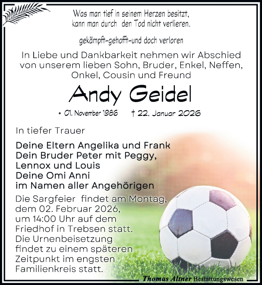 Hier finden Sie alle Traueranzeigen aus der Zeitung, die bisher für Andy Geidel erschienen sind. Weitere Traueranzeigen, die in der Zeitung erscheinen, werden hier ebenfalls aufgelistet