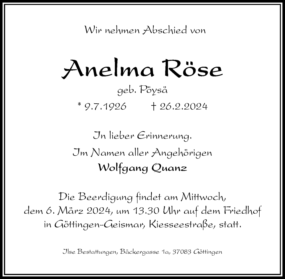 Hier finden Sie alle Traueranzeigen aus der Zeitung, die bisher für Anelma Röse erschienen sind. Weitere Traueranzeigen, die in der Zeitung erscheinen, werden hier ebenfalls aufgelistet