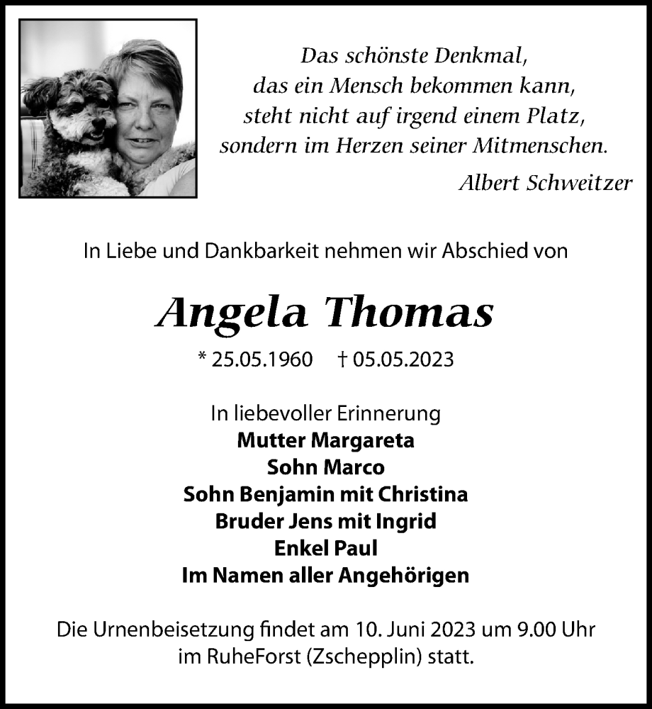 Hier finden Sie alle Traueranzeigen aus der Zeitung, die bisher für Angela Thomas erschienen sind. Weitere Traueranzeigen, die in der Zeitung erscheinen, werden hier ebenfalls aufgelistet