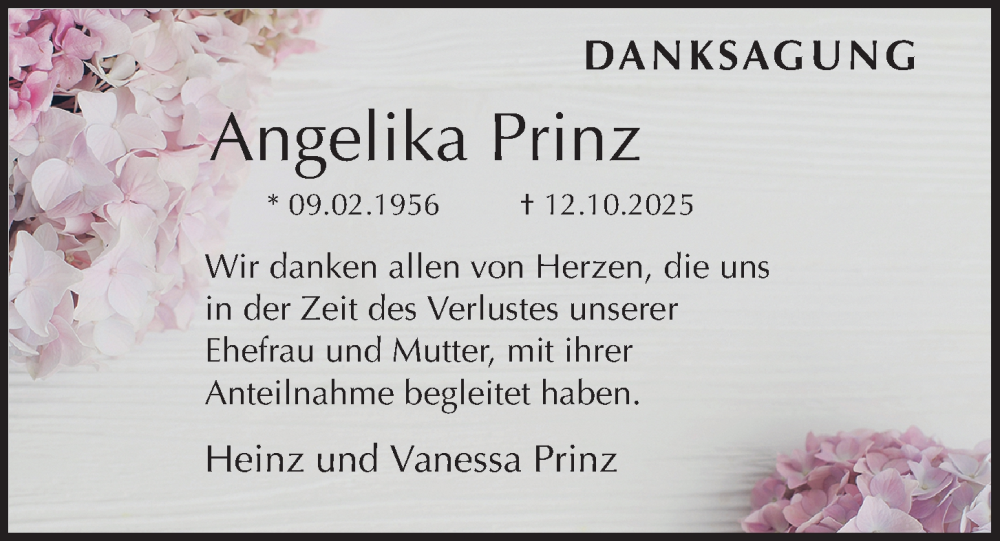 Hier finden Sie alle Traueranzeigen aus der Zeitung, die bisher für Angelika Prinz erschienen sind. Weitere Traueranzeigen, die in der Zeitung erscheinen, werden hier ebenfalls aufgelistet