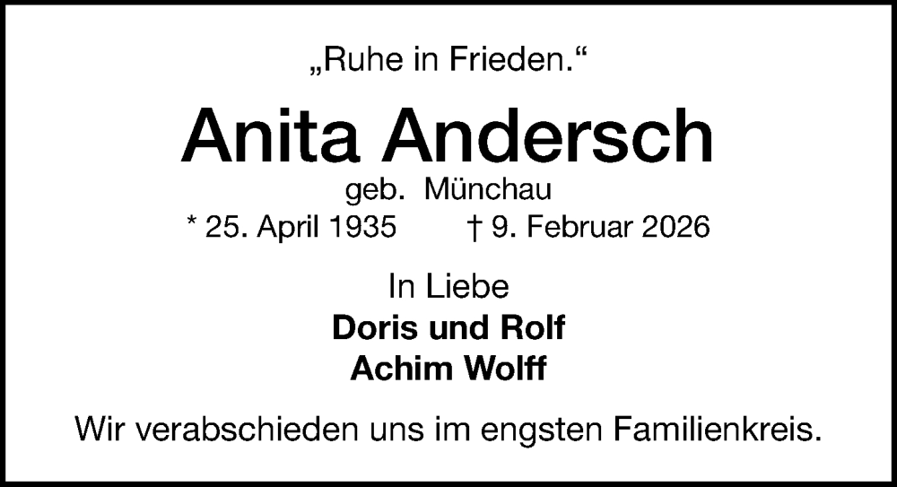 Hier finden Sie alle Traueranzeigen aus der Zeitung, die bisher für Anita Andersch erschienen sind. Weitere Traueranzeigen, die in der Zeitung erscheinen, werden hier ebenfalls aufgelistet