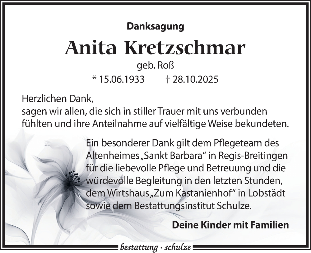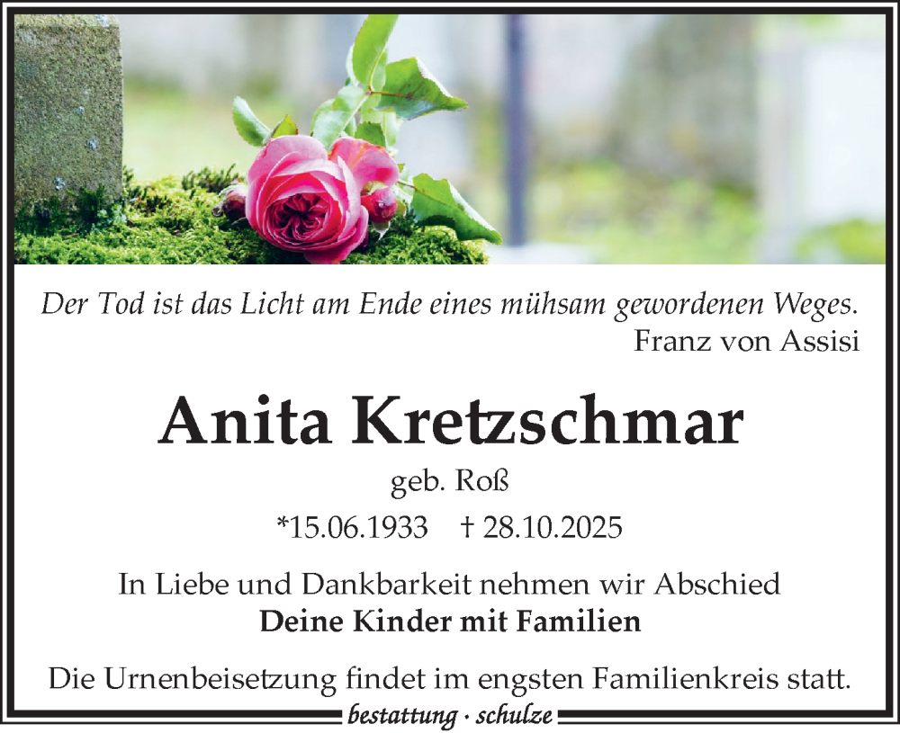 Hier finden Sie alle Traueranzeigen aus der Zeitung, die bisher für Anita Kretzschmar erschienen sind. Weitere Traueranzeigen, die in der Zeitung erscheinen, werden hier ebenfalls aufgelistet