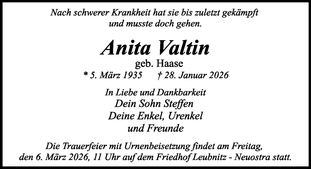 Hier finden Sie alle Traueranzeigen aus der Zeitung, die bisher für Anita Valtin erschienen sind. Weitere Traueranzeigen, die in der Zeitung erscheinen, werden hier ebenfalls aufgelistet