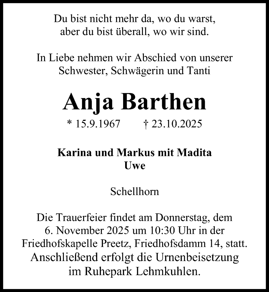 Hier finden Sie alle Traueranzeigen aus der Zeitung, die bisher für Anja Barthen erschienen sind. Weitere Traueranzeigen, die in der Zeitung erscheinen, werden hier ebenfalls aufgelistet