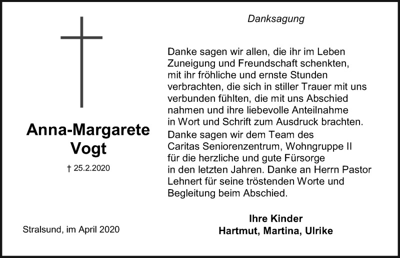 Hier finden Sie alle Traueranzeigen aus der Zeitung, die bisher für Anna-Margarete Vogt erschienen sind. Weitere Traueranzeigen, die in der Zeitung erscheinen, werden hier ebenfalls aufgelistet