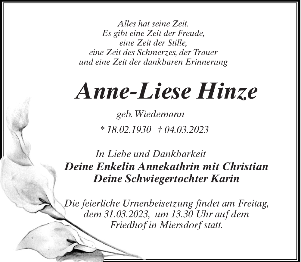 Hier finden Sie alle Traueranzeigen aus der Zeitung, die bisher für Anne-Liese Hinze erschienen sind. Weitere Traueranzeigen, die in der Zeitung erscheinen, werden hier ebenfalls aufgelistet