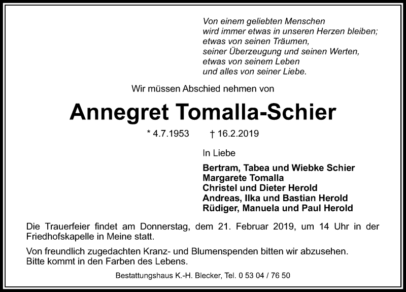 Hier finden Sie alle Traueranzeigen aus der Zeitung, die bisher für Annegret Tomalla-Schier erschienen sind. Weitere Traueranzeigen, die in der Zeitung erscheinen, werden hier ebenfalls aufgelistet