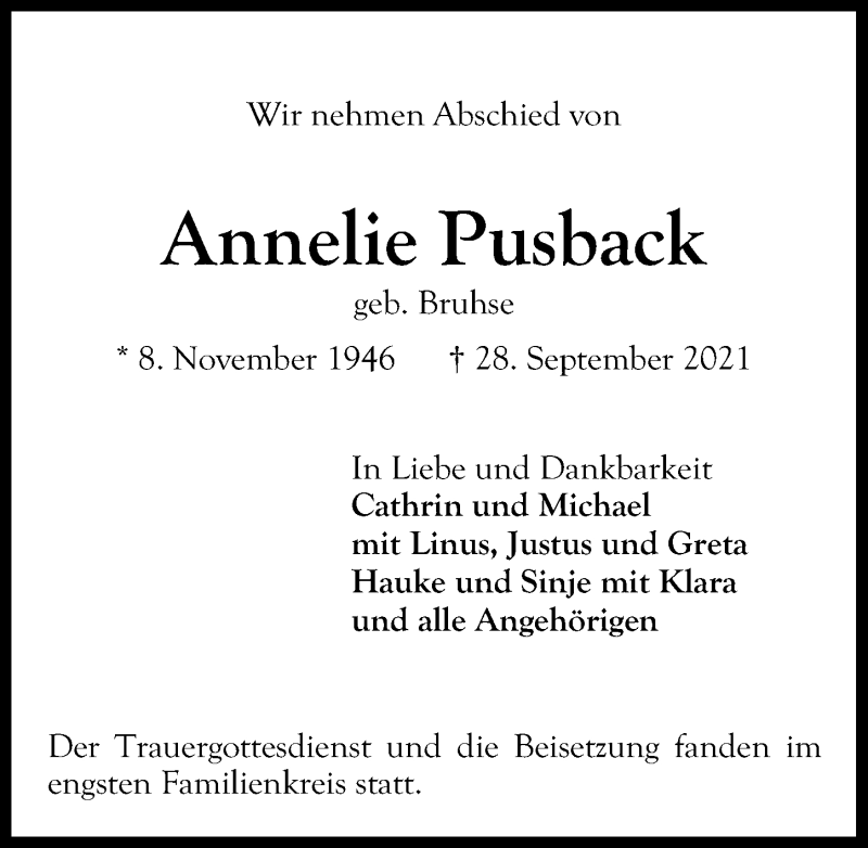 Hier finden Sie alle Traueranzeigen aus der Zeitung, die bisher für Annelie Pusback erschienen sind. Weitere Traueranzeigen, die in der Zeitung erscheinen, werden hier ebenfalls aufgelistet