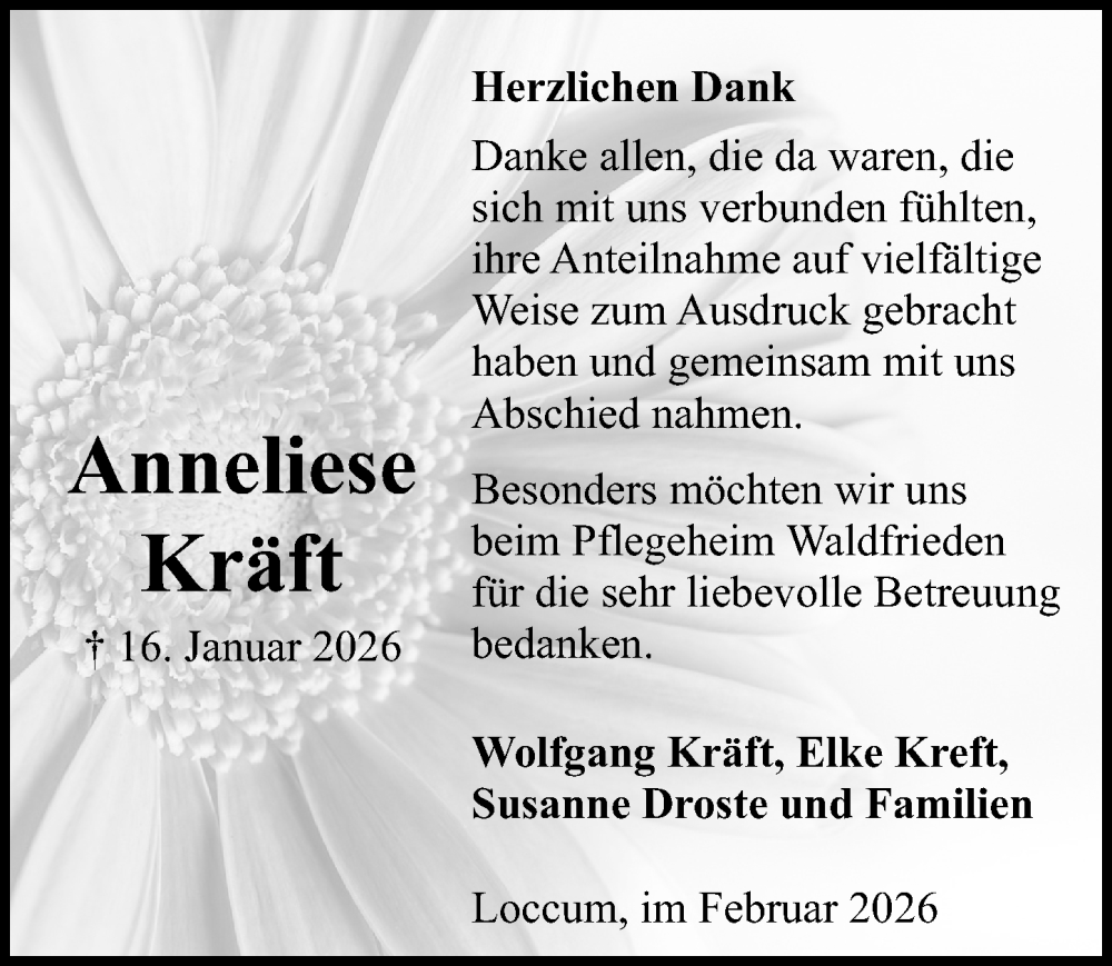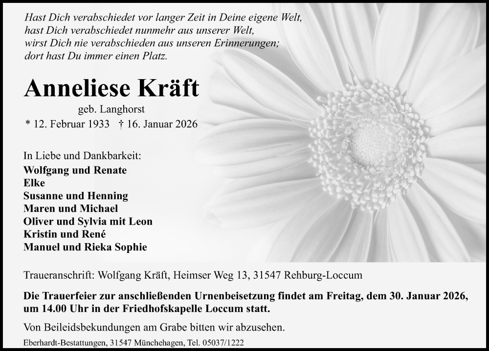 Hier finden Sie alle Traueranzeigen aus der Zeitung, die bisher für Anneliese Kräft erschienen sind. Weitere Traueranzeigen, die in der Zeitung erscheinen, werden hier ebenfalls aufgelistet