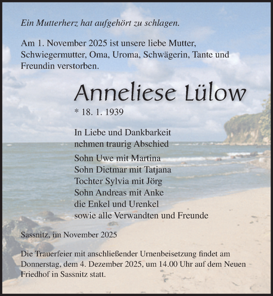 Hier finden Sie alle Traueranzeigen aus der Zeitung, die bisher für Anneliese Lülow erschienen sind. Weitere Traueranzeigen, die in der Zeitung erscheinen, werden hier ebenfalls aufgelistet