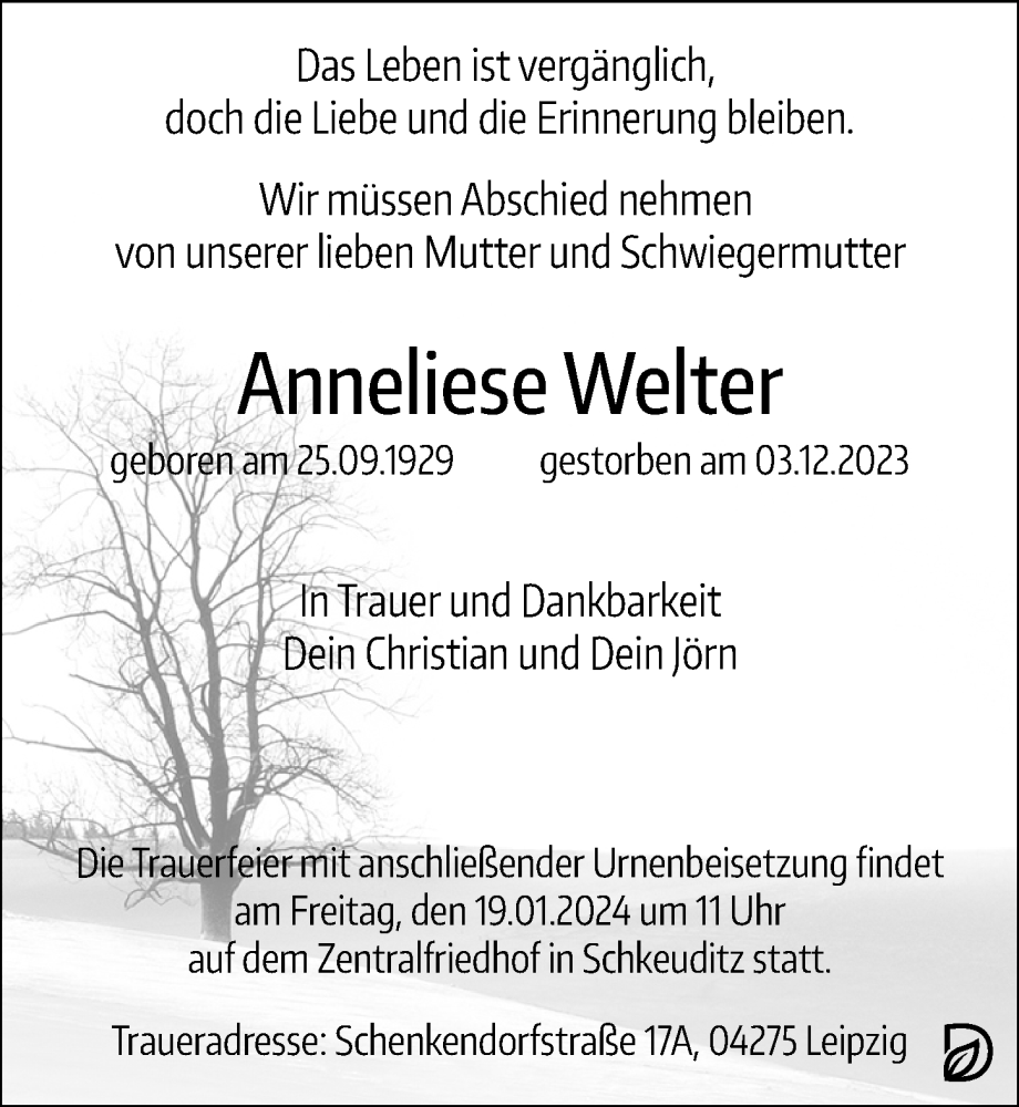 Hier finden Sie alle Traueranzeigen aus der Zeitung, die bisher für Anneliese Welter erschienen sind. Weitere Traueranzeigen, die in der Zeitung erscheinen, werden hier ebenfalls aufgelistet