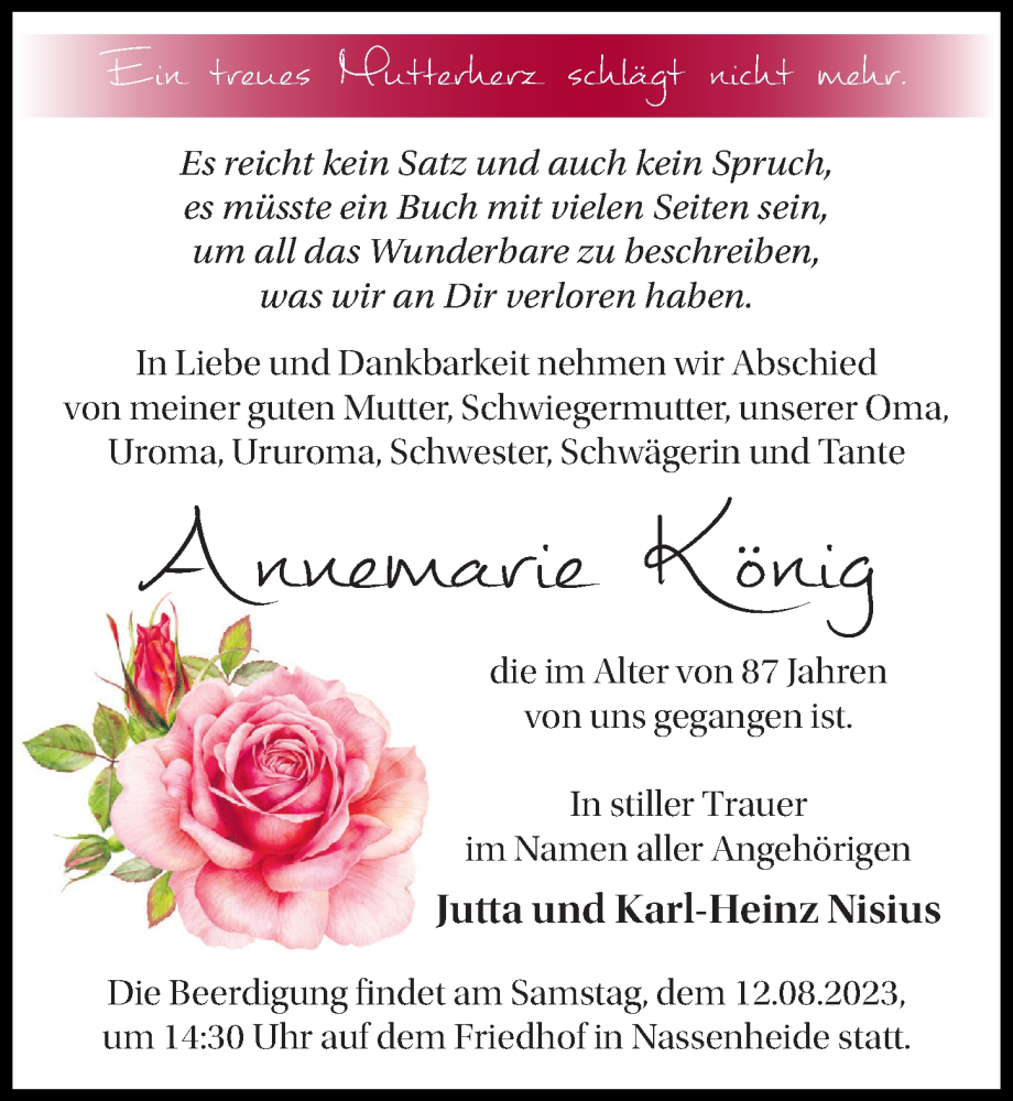 Hier finden Sie alle Traueranzeigen aus der Zeitung, die bisher für Annemarie König erschienen sind. Weitere Traueranzeigen, die in der Zeitung erscheinen, werden hier ebenfalls aufgelistet