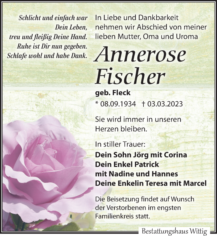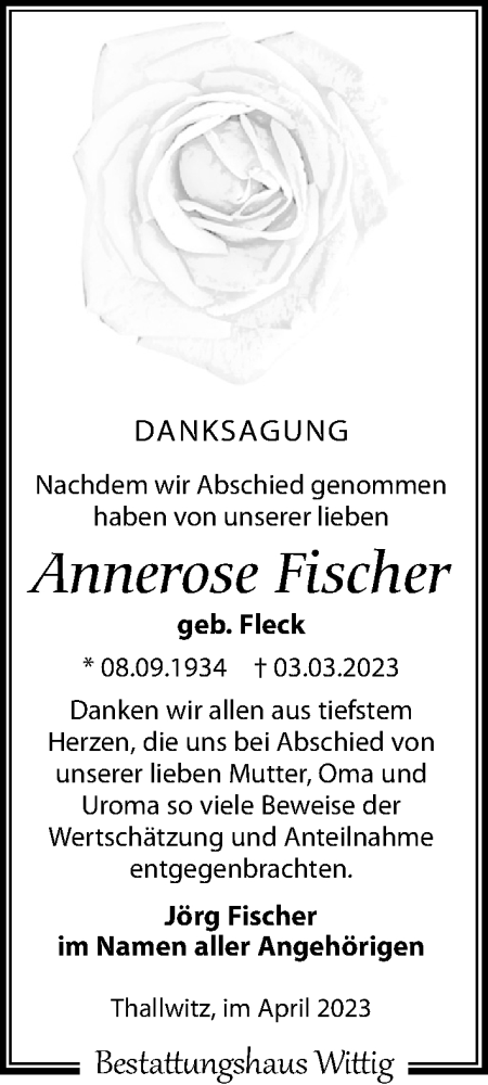 Hier finden Sie alle Traueranzeigen aus der Zeitung, die bisher für Annerose Fischer erschienen sind. Weitere Traueranzeigen, die in der Zeitung erscheinen, werden hier ebenfalls aufgelistet