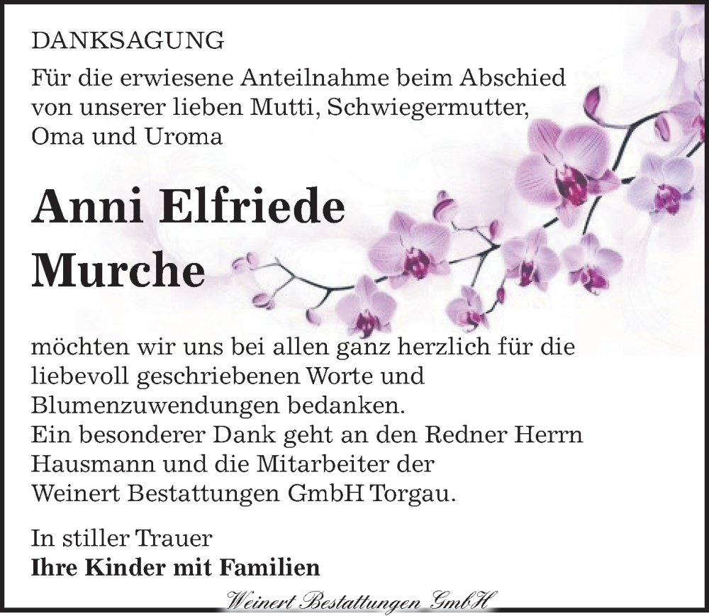Hier finden Sie alle Traueranzeigen aus der Zeitung, die bisher für Anni Elfriede Murche erschienen sind. Weitere Traueranzeigen, die in der Zeitung erscheinen, werden hier ebenfalls aufgelistet