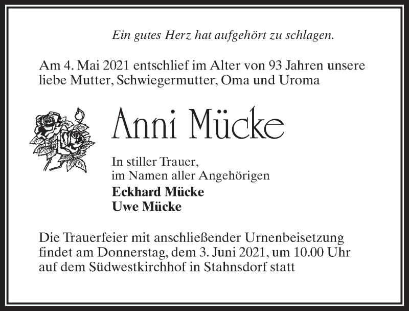 Hier finden Sie alle Traueranzeigen aus der Zeitung, die bisher für Anni Mücke erschienen sind. Weitere Traueranzeigen, die in der Zeitung erscheinen, werden hier ebenfalls aufgelistet