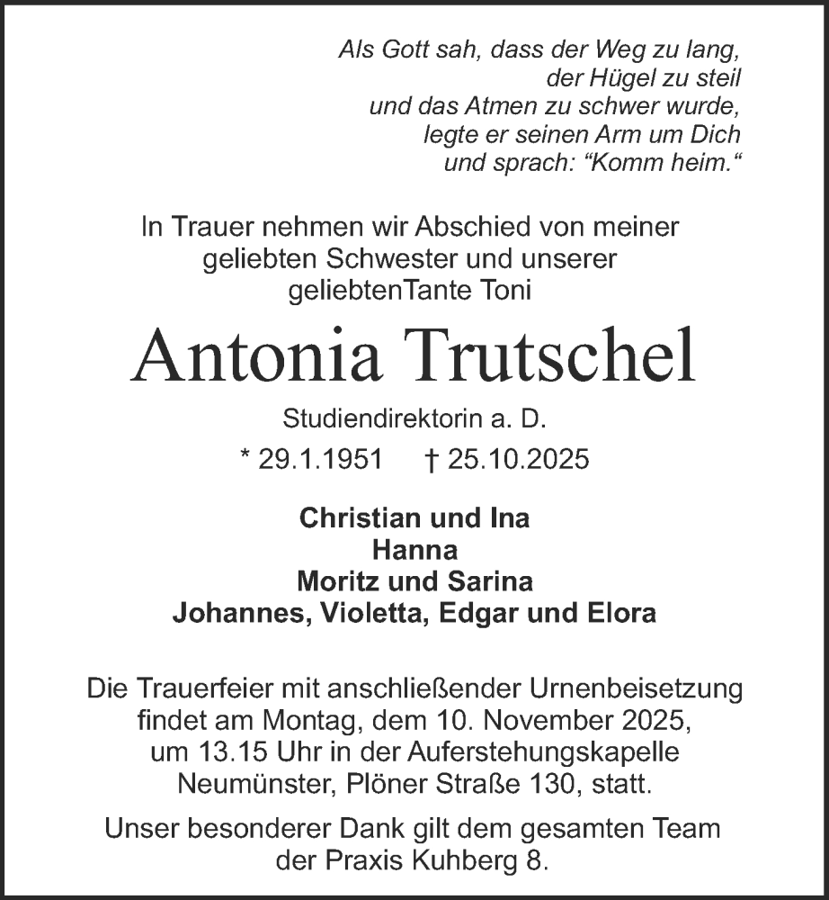 Hier finden Sie alle Traueranzeigen aus der Zeitung, die bisher für Antonia Trutschel erschienen sind. Weitere Traueranzeigen, die in der Zeitung erscheinen, werden hier ebenfalls aufgelistet