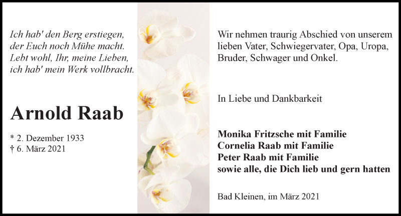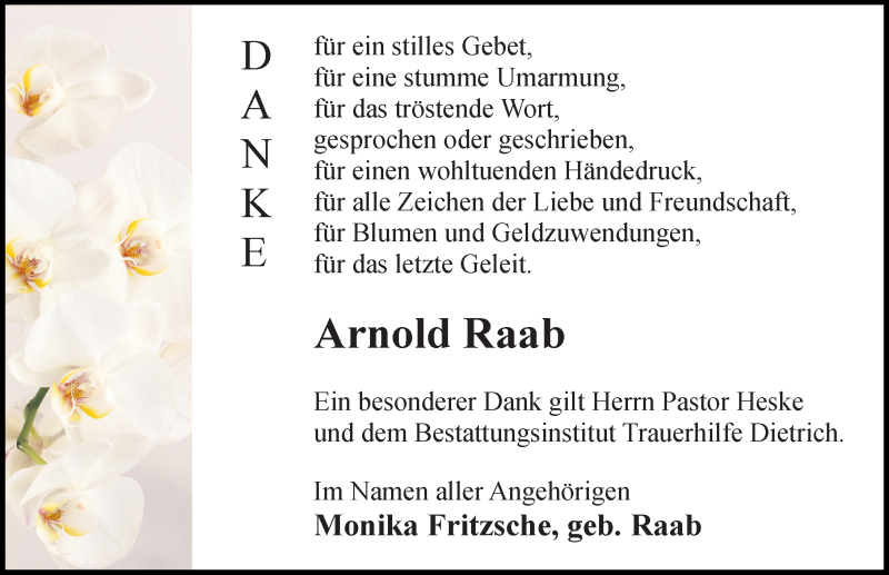 Hier finden Sie alle Traueranzeigen aus der Zeitung, die bisher für Arnold Raab erschienen sind. Weitere Traueranzeigen, die in der Zeitung erscheinen, werden hier ebenfalls aufgelistet