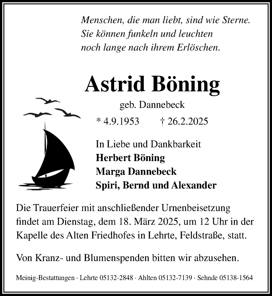 Hier finden Sie alle Traueranzeigen aus der Zeitung, die bisher für Astrid Böning erschienen sind. Weitere Traueranzeigen, die in der Zeitung erscheinen, werden hier ebenfalls aufgelistet