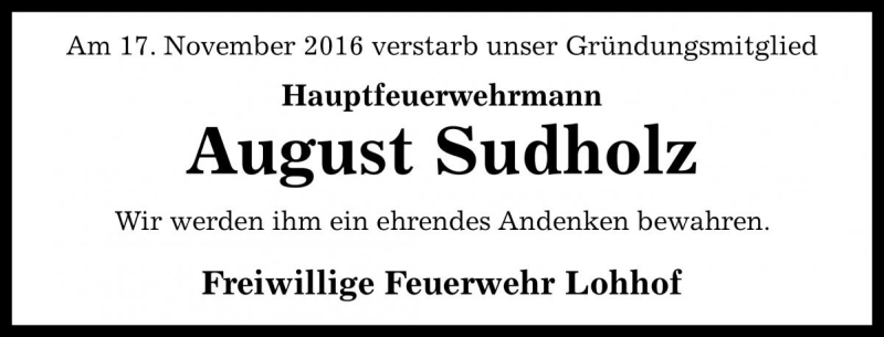 Hier finden Sie alle Traueranzeigen aus der Zeitung, die bisher für August Sudholz erschienen sind. Weitere Traueranzeigen, die in der Zeitung erscheinen, werden hier ebenfalls aufgelistet