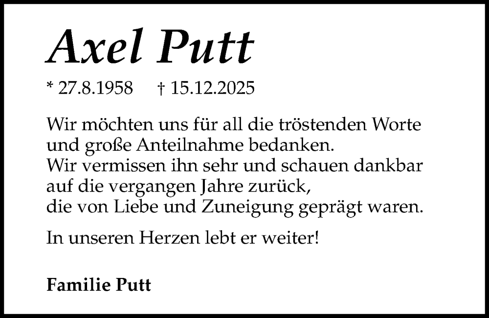 Hier finden Sie alle Traueranzeigen aus der Zeitung, die bisher für Axel Putt erschienen sind. Weitere Traueranzeigen, die in der Zeitung erscheinen, werden hier ebenfalls aufgelistet