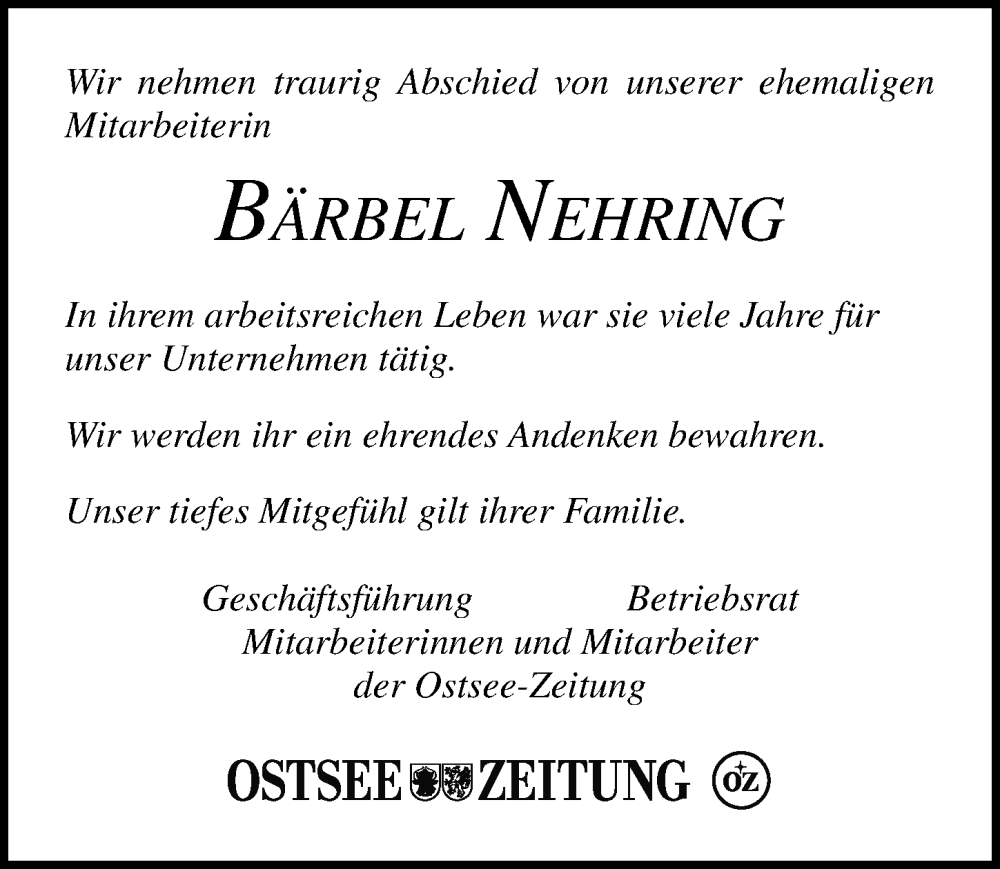 Hier finden Sie alle Traueranzeigen aus der Zeitung, die bisher für Bärbel Nehring erschienen sind. Weitere Traueranzeigen, die in der Zeitung erscheinen, werden hier ebenfalls aufgelistet