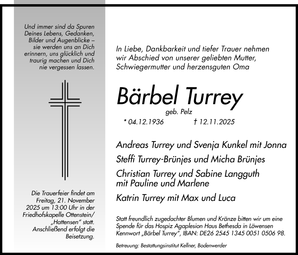 Hier finden Sie alle Traueranzeigen aus der Zeitung, die bisher für Bärbel Turrey erschienen sind. Weitere Traueranzeigen, die in der Zeitung erscheinen, werden hier ebenfalls aufgelistet