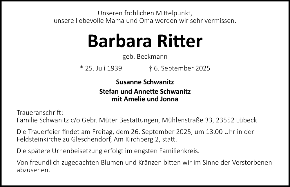 Hier finden Sie alle Traueranzeigen aus der Zeitung, die bisher für Barbara Ritter erschienen sind. Weitere Traueranzeigen, die in der Zeitung erscheinen, werden hier ebenfalls aufgelistet