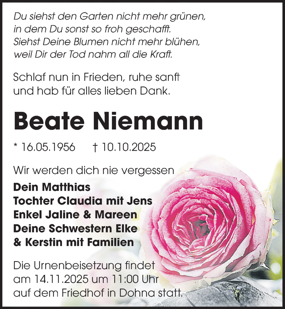 Hier finden Sie alle Traueranzeigen aus der Zeitung, die bisher für Beate Niemann erschienen sind. Weitere Traueranzeigen, die in der Zeitung erscheinen, werden hier ebenfalls aufgelistet