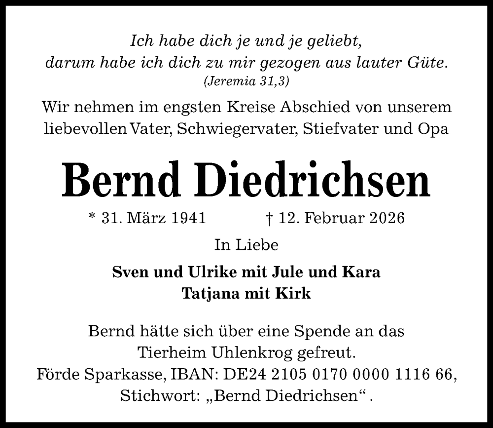 Hier finden Sie alle Traueranzeigen aus der Zeitung, die bisher für Bernd Diedrichsen erschienen sind. Weitere Traueranzeigen, die in der Zeitung erscheinen, werden hier ebenfalls aufgelistet