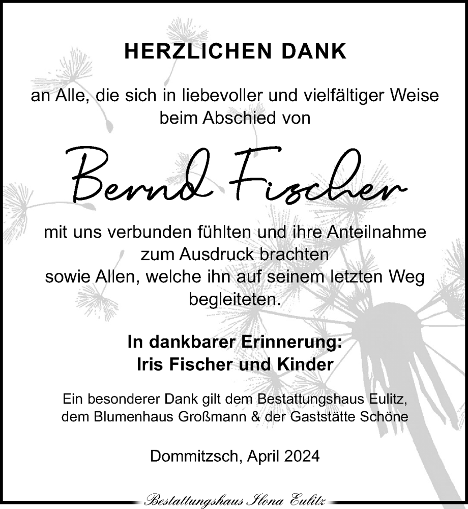 Hier finden Sie alle Traueranzeigen aus der Zeitung, die bisher für Bernd Fischer erschienen sind. Weitere Traueranzeigen, die in der Zeitung erscheinen, werden hier ebenfalls aufgelistet