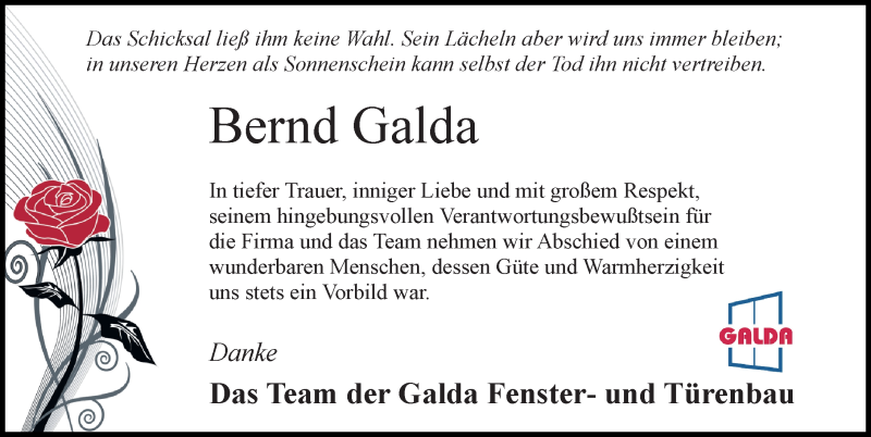 Hier finden Sie alle Traueranzeigen aus der Zeitung, die bisher für Bernd Galda erschienen sind. Weitere Traueranzeigen, die in der Zeitung erscheinen, werden hier ebenfalls aufgelistet