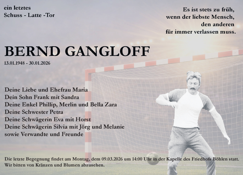 Hier finden Sie alle Traueranzeigen aus der Zeitung, die bisher für Bernd Gangloff erschienen sind. Weitere Traueranzeigen, die in der Zeitung erscheinen, werden hier ebenfalls aufgelistet