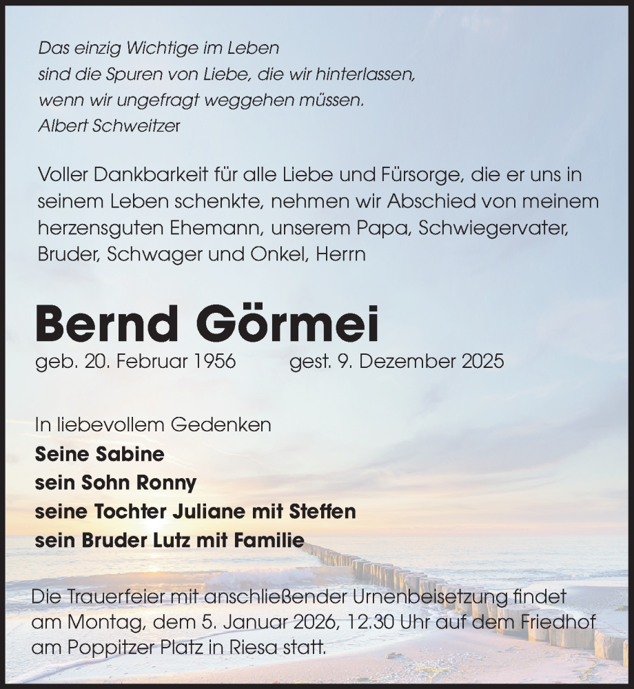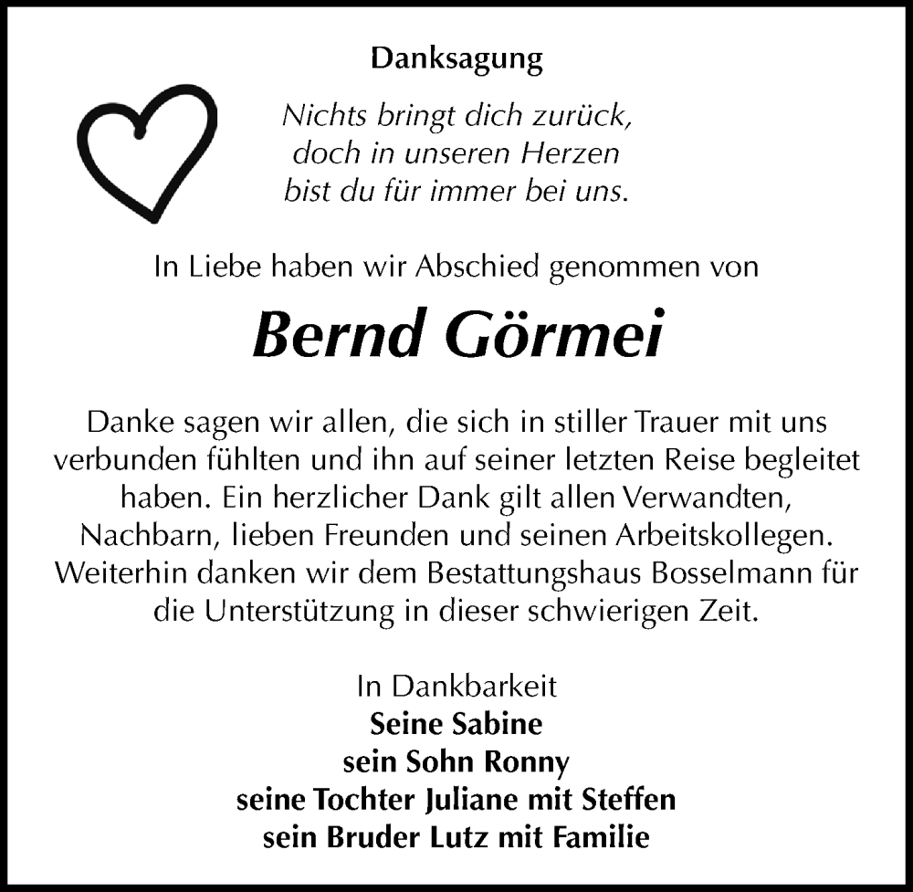 Hier finden Sie alle Traueranzeigen aus der Zeitung, die bisher für Bernd Görmei erschienen sind. Weitere Traueranzeigen, die in der Zeitung erscheinen, werden hier ebenfalls aufgelistet