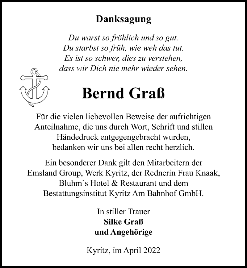 Hier finden Sie alle Traueranzeigen aus der Zeitung, die bisher für Bernd Graß erschienen sind. Weitere Traueranzeigen, die in der Zeitung erscheinen, werden hier ebenfalls aufgelistet