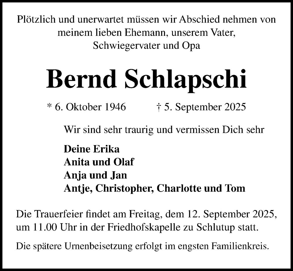 Hier finden Sie alle Traueranzeigen aus der Zeitung, die bisher für Bernd Schlapschi erschienen sind. Weitere Traueranzeigen, die in der Zeitung erscheinen, werden hier ebenfalls aufgelistet