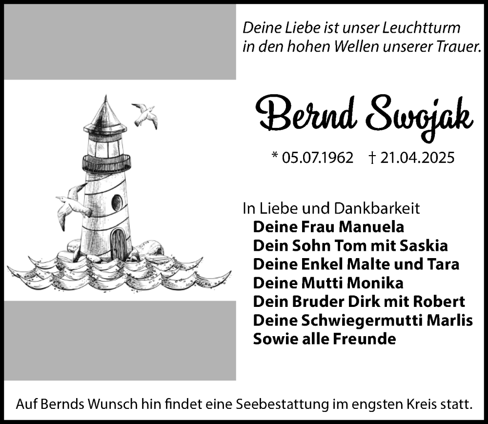 Hier finden Sie alle Traueranzeigen aus der Zeitung, die bisher für Bernd Swojak erschienen sind. Weitere Traueranzeigen, die in der Zeitung erscheinen, werden hier ebenfalls aufgelistet